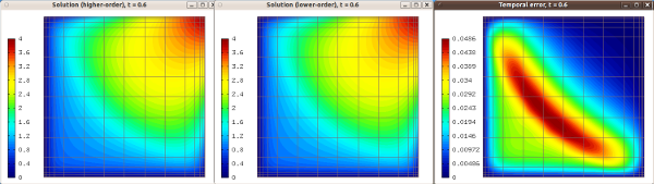 Solution [top-left], Polynomial orders [top-right], temporal error [bottom-left], spatial error [bottom-right]