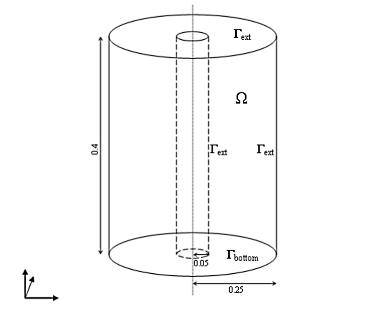 We solve stationary heat transfer in a hollow cylindrical object shown in the following schematic picture: