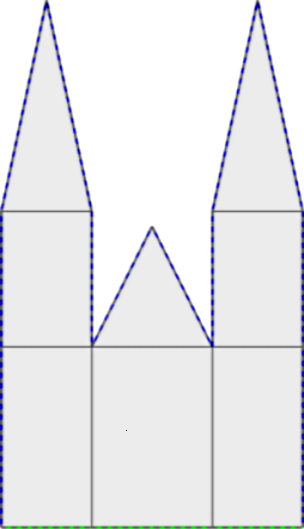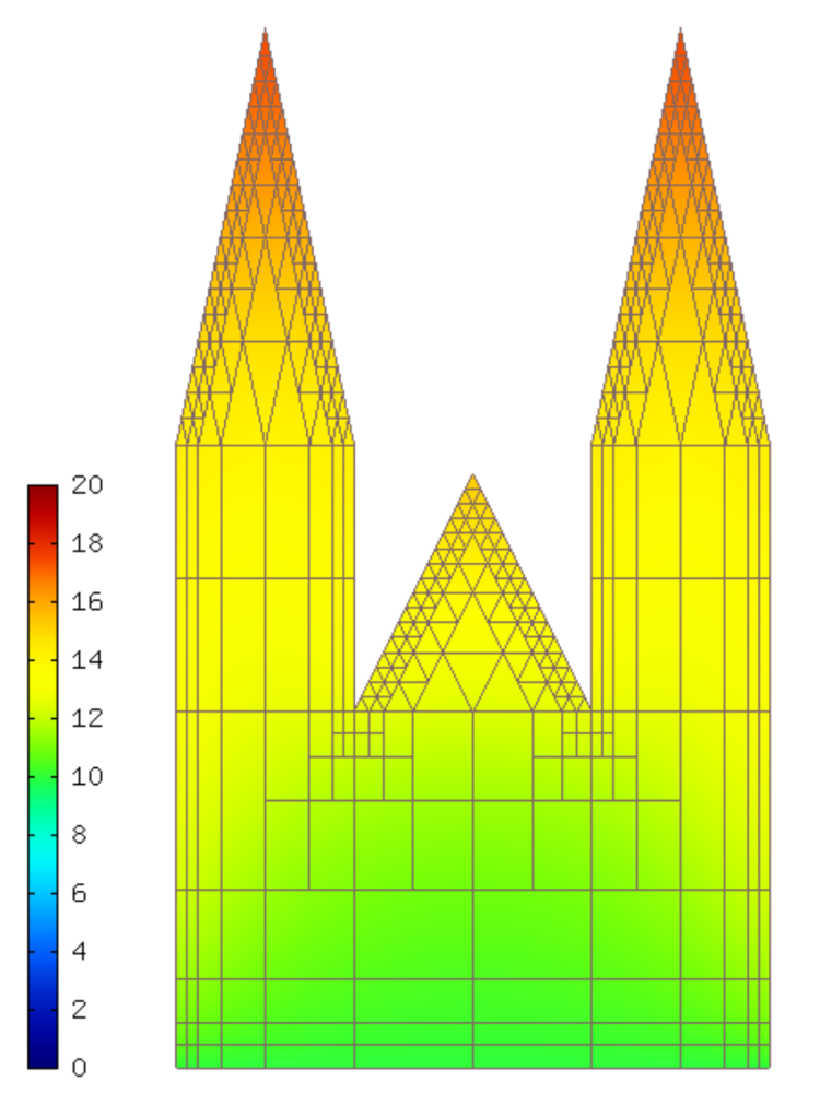This section describes how a time-integration method can be built into the weak formulation of a PDE (usually this is called Rothe’s method). We will illustrate this on the implicit Euler method applied to a heat transfer equation. The equation describes in a naive approximation how the St. Vitus cathedral in Prague responds to changes in the surrounding air temperature during one 24-hour cycle. The geometry is shown below: