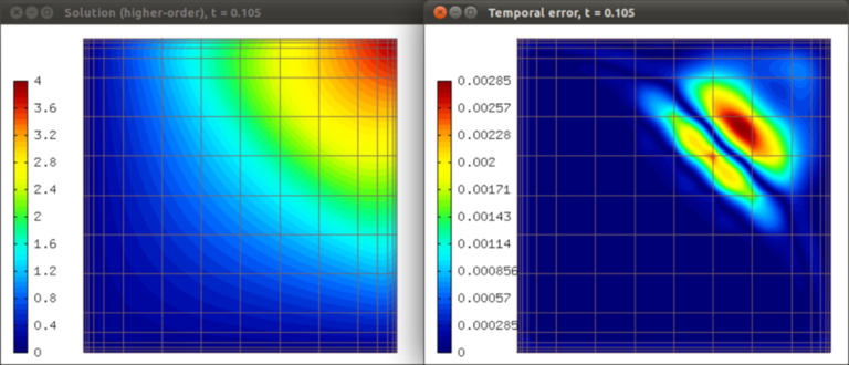 Solution and temporal error at t = 0.105 s: