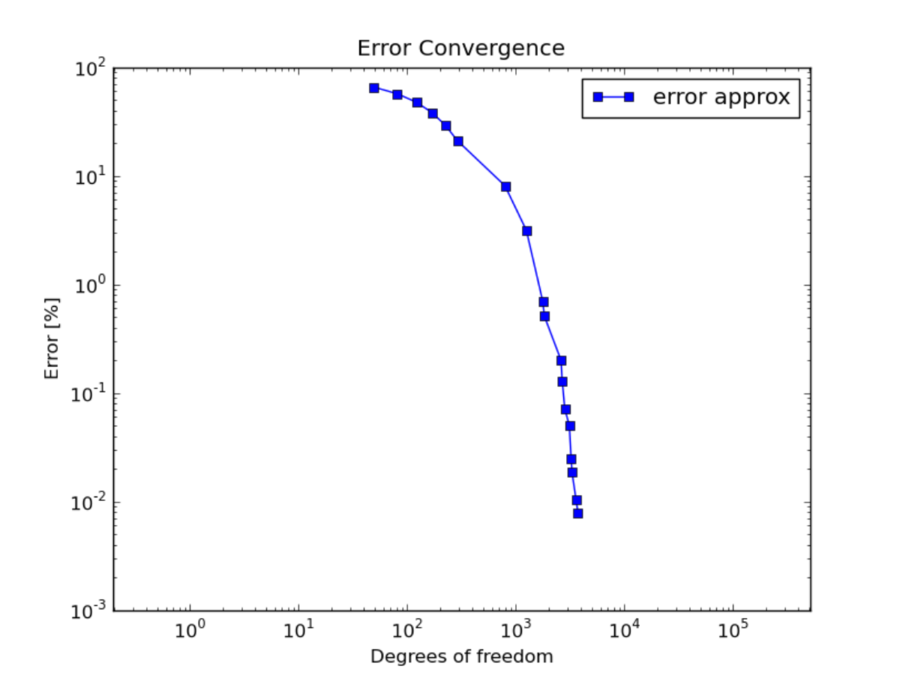 It is predicted by theory that adaptive hp-FEM should attain exponential convergence rate. This means that the slope of the convergence graph is the steeper the more one goes to the right: