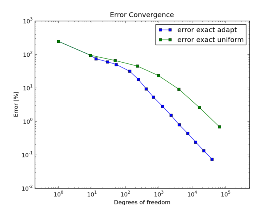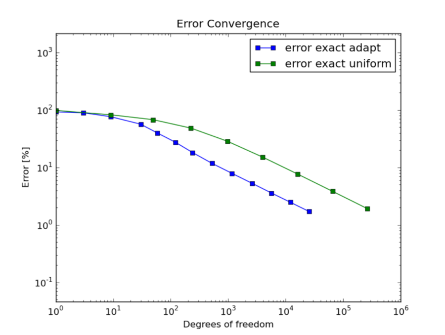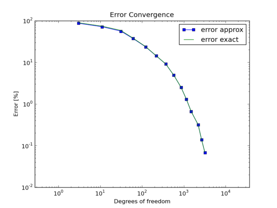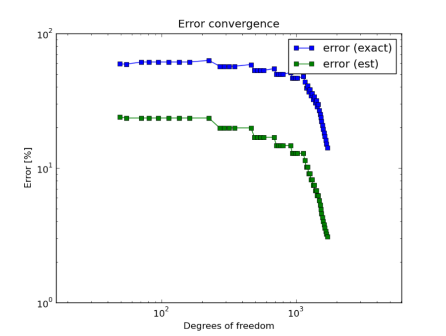 Whenever exact solution is available, Hermes provides both estimated error (via the reference solution) as well as the exact error. Thus the user can see the quality of the error estimate. Note that the estimated error usually is slightly less than the exact one, but during adaptivity they quickly converge together and become virtually identical. This is shown in the figure below.