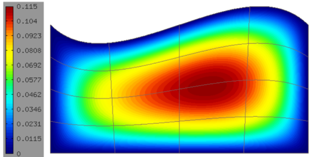 The domain is a rectangle (0,2) x (0, 1) whose upper edge is a NURBS curve. There are three mesh files in this example: domain-1.mesh (one control point), domain-2.mesh (two control points), and domain-3.mesh (three control points). One of these files needs to be selected on line 15 in main.cpp: